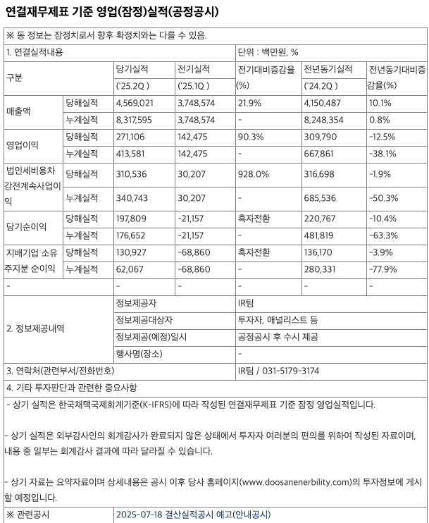 두산에너빌리티/연결재무제표기준영업(잠정)실적(공정공시)/2025.07.25